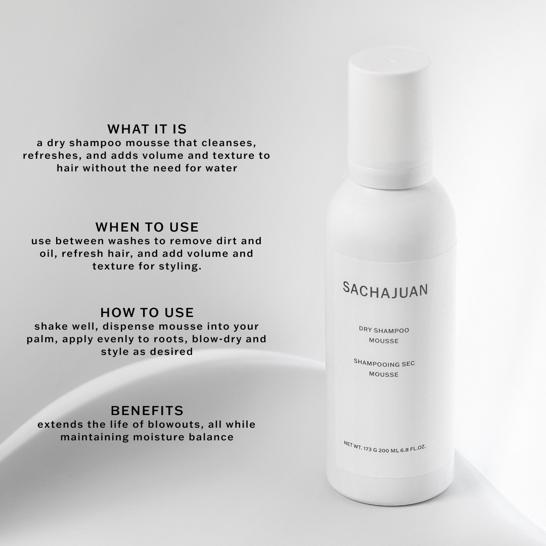SACHAJUAN Dry Shampoo Mousse is a foaming dry shampoo which dries quickly. The mousse gives hair a fresh and clean feel without adding residue or water, or making the hair feel weighed down. In addition to this, the dry shampoo mousse adds texture, volume and shine to all hair types and shades.